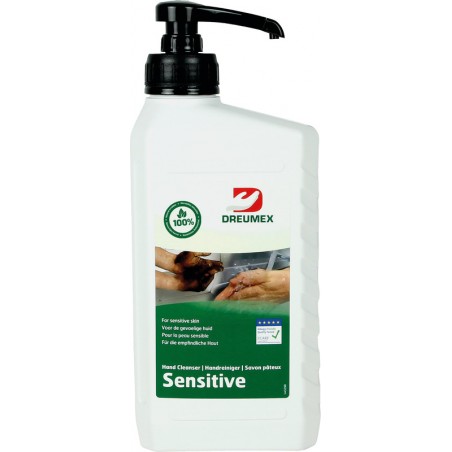 DREUMEX Handreinigungspaste Sensitive geeignet für mittelschwere bis schwere industrielle Verschmutzungen, gründliche Reinigung durch Mikrokörner, enthält allergenfreie Zutaten, dermatologisch getestet, parfüm-, farbstoff-, lösungsmittel- und silikonfrei. inkl. Pumpe