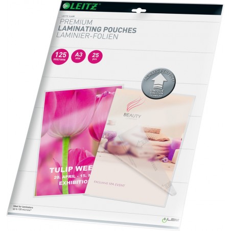 LEITZ® Laminierfolien iLAM UDT auf 3 Seiten offen, einfaches und perfektes Laminieren mit der Unique Direction Technology, einfache Verwendung, da die Einlegerichtung vorgegeben ist, Laminieren ohne Folienstau ist dadurch garantiert, einwandfreies Verschliessen der Folie. UDT: die patentierten Pfeile geben die Einlegerichtung vor und verschwinden während dem Laminiervorgang. Grösse A3, 303 x 426 mm