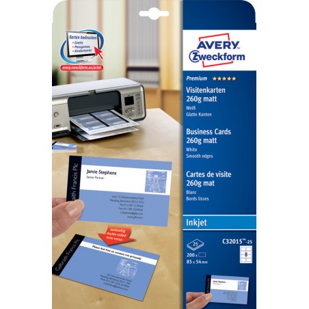 AVERY® ZWECKFORM Visitenkarten Quick & Clean mit schnittglatten Kanten, weiss, beidseitig bedruckbar, auf Bogen DIN A4, Format 85 x 54 mm. Geeignet für Inkjetdrucker. Nachhaltigkeit eco:plus: Zertifikat: FSC. matt