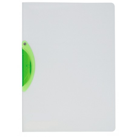 KOLMA® easy Klemmhefter Plus aus farblos halbtransparentem KolmaFlex-Material, Vorderdeckel ist ganz aufklappbar, Klemme aus farbig transparentem Kunststoff, Fassungsvermögen bis 30 Blatt 80 g/m2, für Format A4. Nachhaltigkeit eco:plus: zerlegbar konstruiert, recyclingfähig, Recycelgehalt Abfall nach Gebrauch max. 100%.