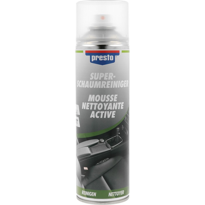 PRESTO® Super-Schaumreiniger für Haushalt und Auto, grosse Lösekraft, entfernt leicht Staub, Schmutz, Fett, Nikotin und Insekten, auf Wasserbasis, trocknet schnell, aus einem Abstand von 20 cm gleichmässig auf den zu behandelnden Untergrund sprühen, angenehmer Geruch. Dose zu 500 ml.