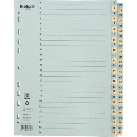 BIELLA Register Vollformat blau/gelb, mit Indexdruck aus Recyclingkarton, 210 g/m2, Tabs verstärkt. Nachhaltigkeit eco:plus: recycelter Bestandteil. Zertifikat: FSC.
