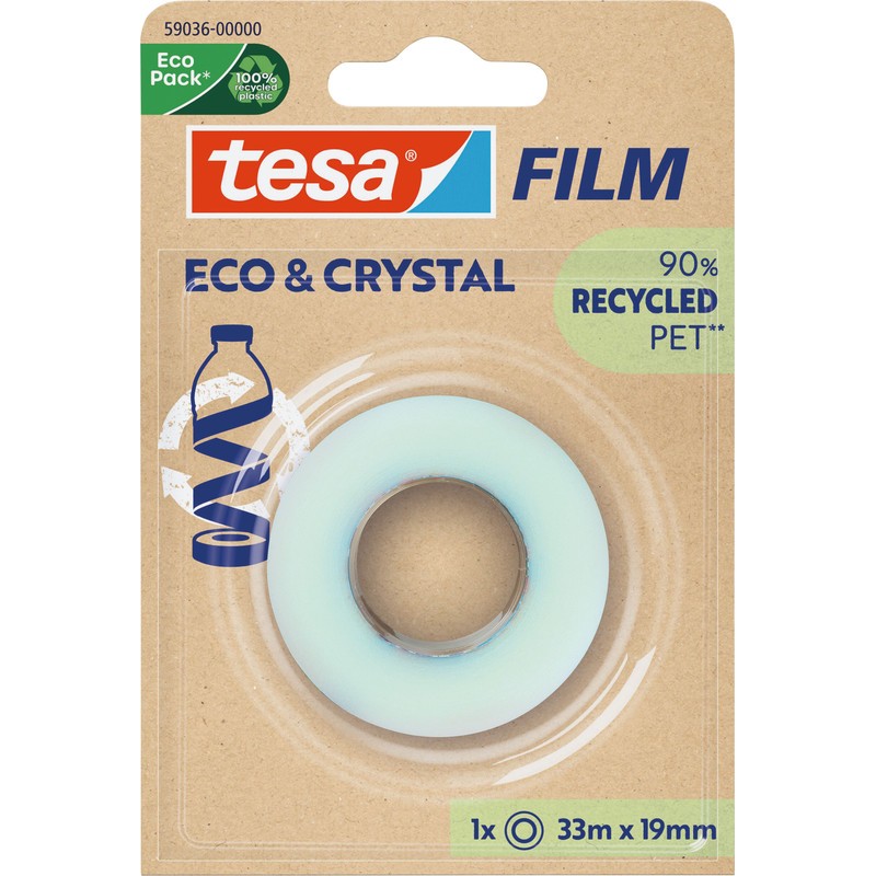 TESA® Klebeband Film eco & crystal ecoLogo® Trägerfolie aus 90% recycelten PET-Flaschen (rPET), Rollenkern aus 100% recyceltem Kunststoff, transparente, klare Qualität, nahezu unsichtbar auf fast allen Untergründen, starke Klebkraft, gleichmässiges und geräuschloses Abrollen, hohe Alterungsbeständigkeit, lösungsmittelfrei. Nachhaltigkeit eco:plus: abbaubar, recyclingfähig, recycelter Bestandteil, Recycelgehalt Abfall vor Gebrauch max. 10%, Recycelgehalt Abfall nach Gebrauch max. 10%, Abfallminderung.