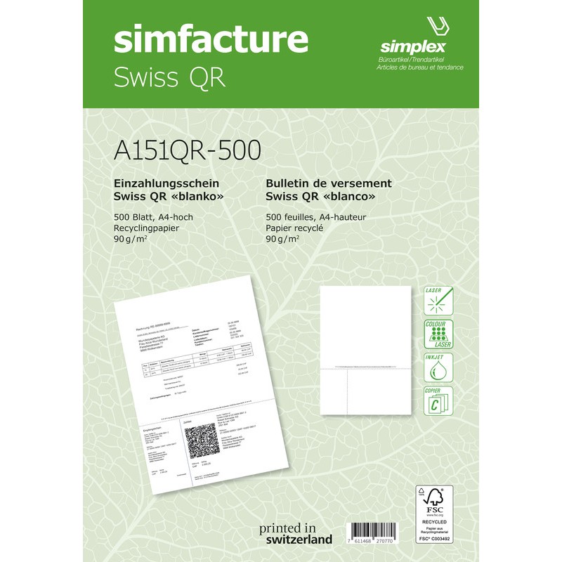 SIMPLEX Rechnungsformulare simfacture Swiss QR Recycling für QR-Rechnung separater Zahlteil mit Empfangsschein, perforiert, Format A4, weiss, einfaches Drucken der Rechnungsformulare. Geeignet für Kopierer/ Laser-, Inkjetdrucker und Farblaserdrucker/ -kopierer. Nachhaltigkeit eco:plus: Zertifikat: FSC.