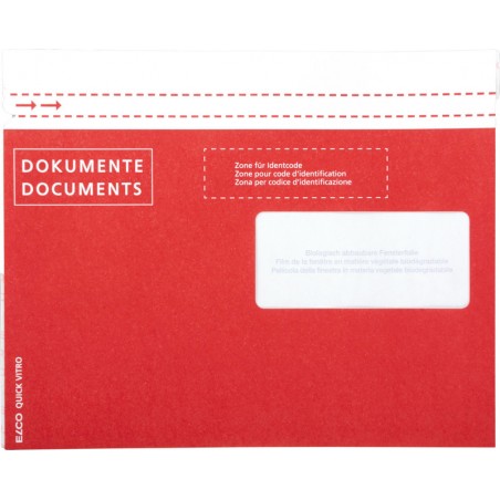 ELCO Quick Vitro Papier Dokumententaschen Dokumente/Documents postkonform, aus Kraftpapier, 110 g/m2, mit Aufreissperforation, Tasche rot, opak, mit ausgespartem Fenster, biologisch abbaubare Fensterfolie, Text weiss. Passend für Briefumschläge, Rückseite, Klappe und Anklebeverschluss selbstklebend. Nachhaltigkeit eco:plus: recyclingfähig. Zertifikat: FSC. Schachtel zu 250 Stück