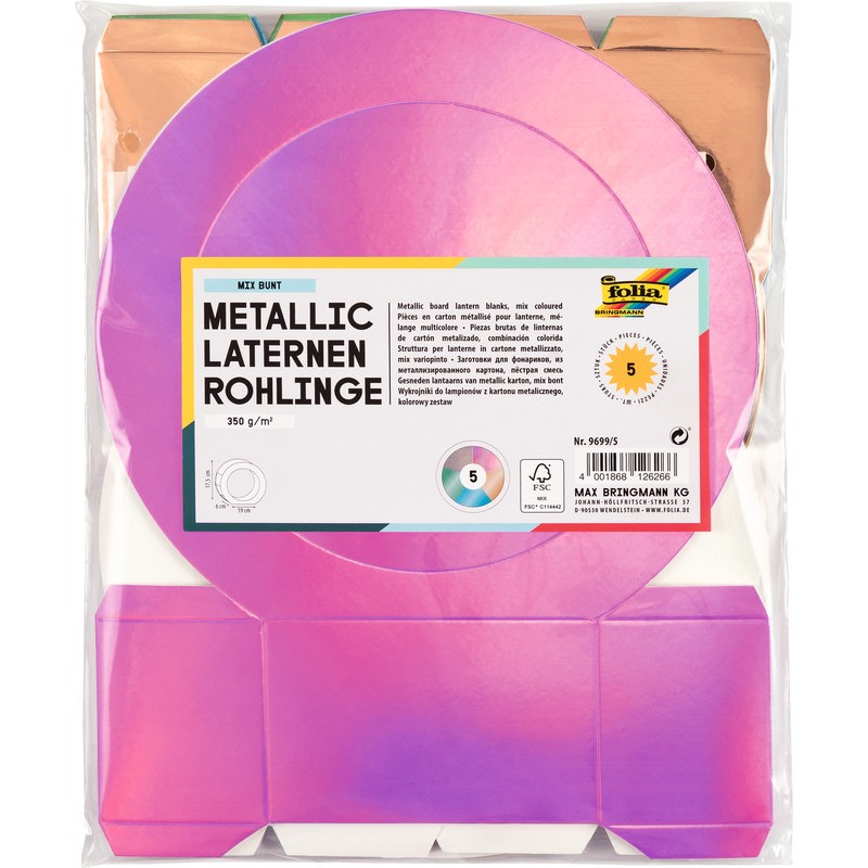 FOLIA® Laternen-Rohlinge Metallic aus Karton, 350 g/m2. Masse: Ø 190, H 115 mm. Packung zu 5 Stück.