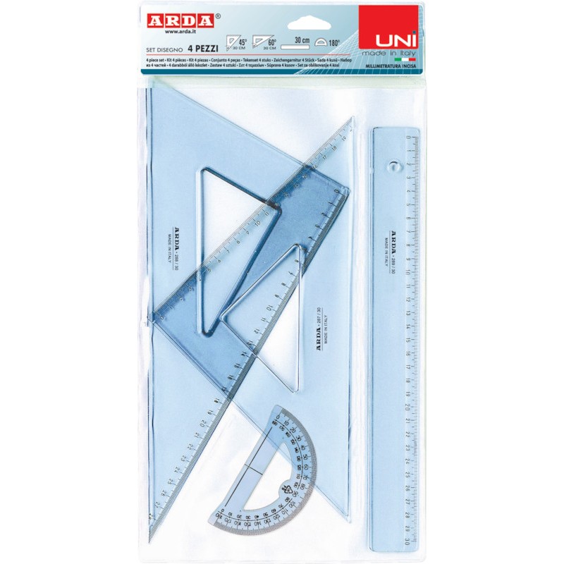 ARDA® Zeichenset 4-teilig aus Kunststoff, mit Facette und Tuschekante, Masseinteilung in mm. Packung zu Massstab 30 cm, Geodreieck 45° 30 cm, Geodreieck 60° 30 cm und Transporteur 180° 10 cm.