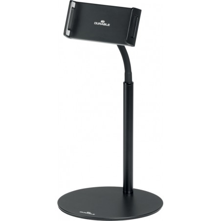 DURABLE Tablet- und Handyhalter Twist aus Stahl und ABS, robuster Tischständer, flexibel nutzbar, mit Schwanenhals für stufenlose Höheneinstellung, um 360° drehbar, Verwendung des Tablets/Handys im Hoch- und Querformat, integrierter Kabeldurchlass, frei zugängliche Anschlüsse, für alle Handy- und Tablet-Formate von 4,7 - 13', bis 800 g, gummierte Halte- und Trageflächen schützen das Tablet und das Handy vor Beschädigungen. Masse: B 190 x H 370 x T 190 mm.