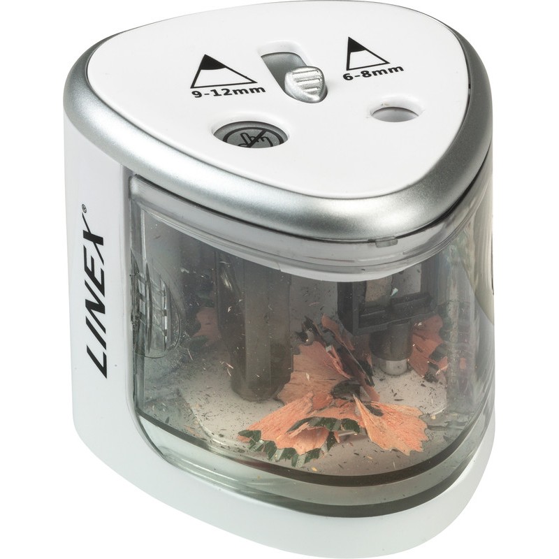 LINEX® Spitzmaschine Gehäuse aus Kunststoff, mit Behälter, batteriebetriebener Elektromotor (4 Batterien AA, nicht mitgeliefert), für Stifte von Ø 6 - 8 mm und von Ø 9 - 12 mm.