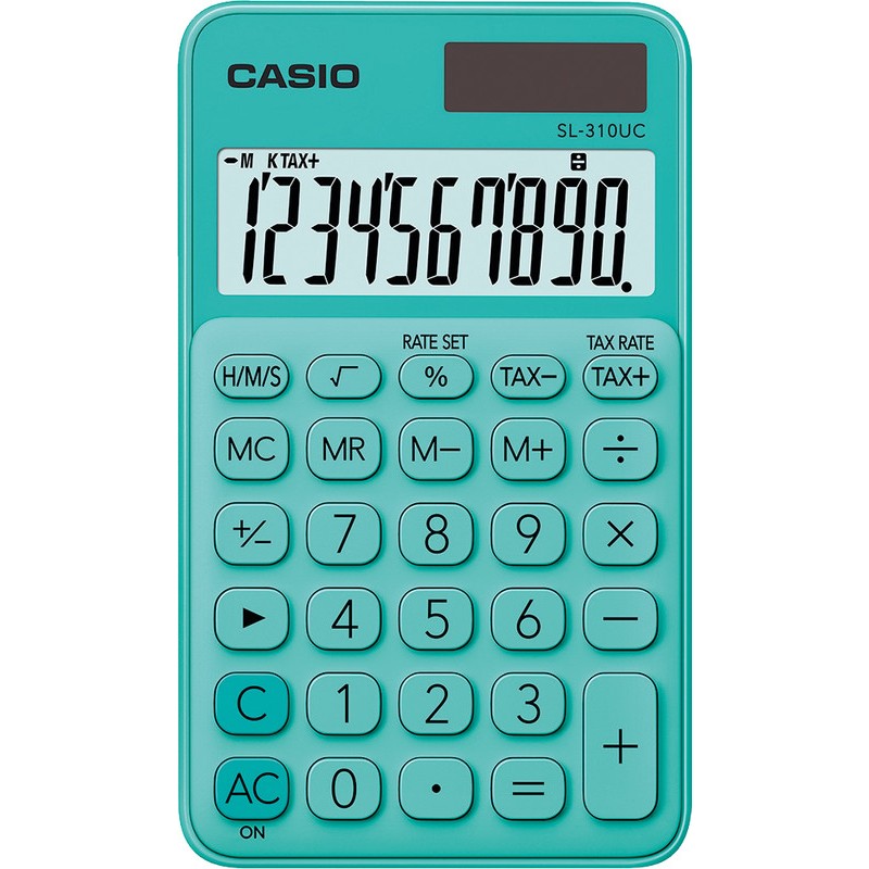 CASIO® Taschenrechner SL-310UC mit 10-stelliger LCD-Anzeige, Prozent-, Wurzel-, Steuer- Zeitberechnung, 4-Tasten-Speicher, Vorzeichenwechsel, Schnellkorrekturtaste, automatische Abschaltfunktion, Stromversorgung: Solar- und Batteriebetrieb. Masse: B 70 x H 8 x T 118 mm. Gewicht: 50 g. Preis inkl. VRG.