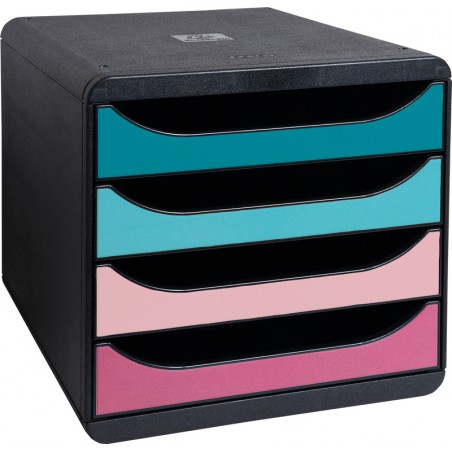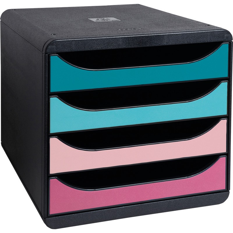 EXACOMPTA Schubladenelement Big-Box aus PS, langlebig, widerstandsfähig und stabil, leicht offene Schubladenfronten für direktes Einlegen der Unterlagen ohne Öffnen der Schubladen, Auszugsstopp, für Format A4/A4+, Querformat. Aussenmasse: B 278 x H 347 x T 267 mm. 4 geschlossene Schubladen