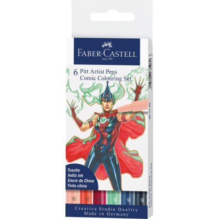 FABER-CASTELL Tuschestifte Pitt Artist Pen Comic Illustration Colouring geeignet für den Einstieg ins Comiczeichnen, perfekt für Outlines und Schattierungen, hohe Lichtbeständigkeit, geruchsneutral, säurefrei, pH-neutral, wasserfest, schlägt nicht durchs Papier, pigmentierte Zeichentusche. Etui zu Tuschestifte Pinselspitze scharlachrot, karminrosa, beigerot, indigo dunkel, phthalogrün hell und indanthrenblau.