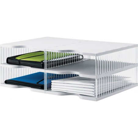STYROBIG Dokumentenablage für Maxi-Formate aus PS, Sortierstation für Überformate, lässt sich einfach zusammenstecken, erweiterbar in der Höhe, sehr stabil, Griffmulde für leichte Entnahme, inkl. Beschriftungsmaterial und 4 Klebefüsse für die Fixierung am Tisch, Seitenteile transparent, Boden hellgrau. Masse pro Fach: B 280 x H 90 x T 390 mm. Duo-Tower, 2 Etagen/4 Fächer Aussenmasse: B 600 x H 220 x T 400 mm.