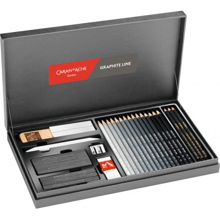 CARAN D'ACHE Bleistifte Graphite Line Holzkoffer geeignet für technisches und künstlerisches Zeichnen, Punktieren, Schraffieren, Schreiben, Vorzeichnen, Schattieren und Verwischen. Inhalt: 15 Graphitstifte Grafwood (9B - 4H), 3 wasservermalbare Stifte Technalo (2B, B, HB), 3 Grafcube 10 mm, 3 Grafcube 15 mm, Schmirgelbrettchen, Papierwischer, Doppelspitzer und Radiergummi Technik, in Holzkoffer aus Buchenholz. Nachhaltigkeit eco:plus: umweltfreundliche Verpackung. Zertifikat: FSC.