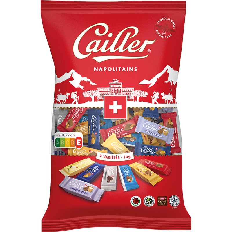 CAILLER® Schokolade Napolitains einzeln verpackt, 7 Sorten sortiert, Lait-Amandes, Lait Des Alpes Suisses, Dessert, Lait-Noisettes, Crémant, Chocmel® und Blanc.