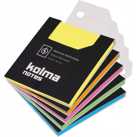 KOLMA® Haftnotizen Notes statisch geladene Haftnotizen, haftet auf allen sauberen Oberflächen, die Blätter lassen sich leicht versetzen, weisse Rückseite beschreibbar und trocken abwischbar, beidseitig nutzbar, geeignet für Notizen, Präsentationen und Brainstorming. Nachhaltigkeit eco:plus: recyclingfähig, Recycelgehalt Abfall nach Gebrauch max. 100%. Format: 76 x 76 mm farbig sortiert, neongrün, neonblau, neongelb, neonorange und neonpink