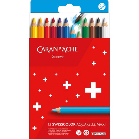 CARAN D'ACHE Farbstifte Swisscolor(TM) Aquarelle Maxi wasservermalbare Aquarellfarbstifte, lichtechte Farben, hohe Deckkraft, Mine Ø 6 mm, geeignet für Trocken- und Nasszeichnen, Aquarelle, Feinzeichnen und Malen, für Nachwuchskünstler und Familien, in Kartonetui. Nachhaltigkeit eco:plus: Abfallminderung, umweltfreundliche Verpackung. Zertifikat: FSC.