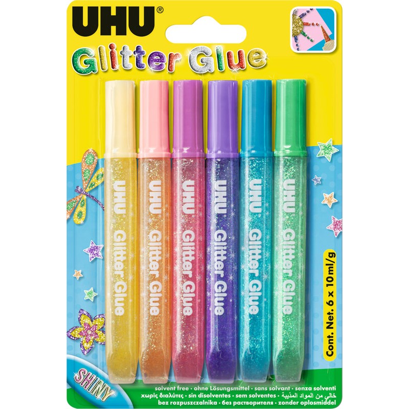 UHU® Glitter Glue zum kreativen Gestalten und Kleben, eignet sich für Papier, Karton, Holz, Kork und Textilien, trocknet in 45 Min., lösungsmittelfrei, waschbeständig bis 40°C, auswaschbar solange der Klebstoff nicht ausgehärtet ist.