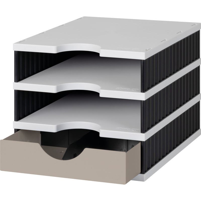 STYRODOC Dokumentenablage uno Set aus PS, mit offenen Fächern bis Format C4 und praktischen Systemschubladen zur Aufbewahrung von Kleinmaterial, vielseitig einsetzbar, freistehend auf dem Schreibtisch, als Monitorhalter, in Regalen oder Schränken sowie als Drucker- oder Kaffeestation, lässt sich einfach zusammenstecken, erweiterbar, sehr stabil, Griffmulde für leichte Entnahme, Standard-Fachhöhe innen 57 mm, mit Unterteilungssets und Beschriftungsmaterial.