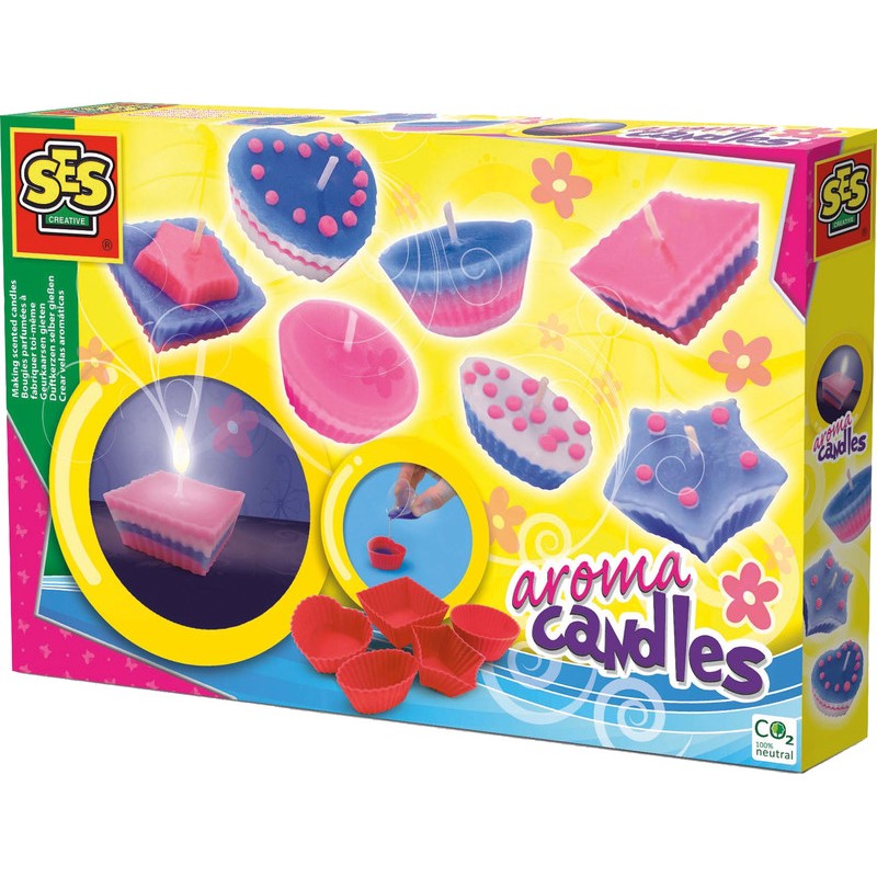 SES® Bastelset Duftkerzen ab 6 Jahren, Kerzenwachs in der der Mikrowelle flüssig werden lassen, den Wachs in die verschiedenen Formen giessen und den Docht reinstecken, anschliessend warten bis der Wachs hart ist. Set zu 5 Silikonförmchen, 3 Blöcke Wachs in weiss, blau und rot, Kerzendocht, Messbecher, Karten um den Docht in der Mitte der Kerze zu fixieren und eine Anleitung.