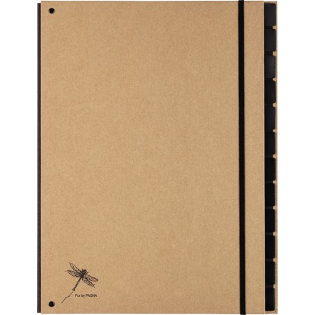 PAGNA® Pultordner Pur aus Recyclingkarton, mit Kraftpapier überzogen, natur, mit Prägung einer Libelle, schwarze Tabs, 3 Schaulöcher, mit Gummibandverschluss, dehnbarer Rücken, für Format A4. Masse: B 265 x H 340 x T 15 mm. Nachhaltigkeit eco:plus: kompostierbar, recyclingfähig.