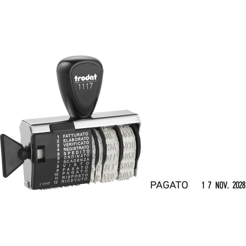 TRODAT® Wort- und Datumstempel 1117 aus Metall, mit Einstellhilfe auf dem Kunststoffgehäuse, verschiedenen Standardtexten auf verstellbaren Gummibändern, in Verbindung mit dem Datum, einfaches Wechseln der Texte durch Einstellrad. Texte: EINGEGANGEN, BEANTWORTET, ERLEDIGT, BESTELLT, GEMAHNT, BEZAHLT, ÜBERWIESEN, BETRAG ERH., FAKTURIERT, KONTROLLIERT, GEBUCHT, TERMIN.