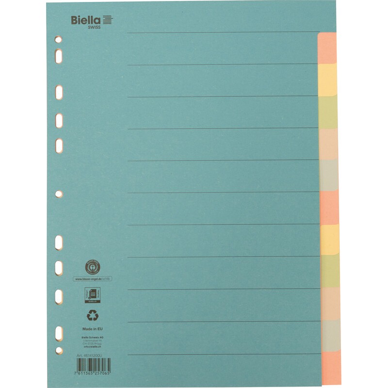 BIELLA Register Vollformat farbig, mit Indexdruck aus Recyclingkarton, 170 g/m2, Indexblatt 200 g/m2. Nachhaltigkeit eco:plus: recycelter Bestandteil.