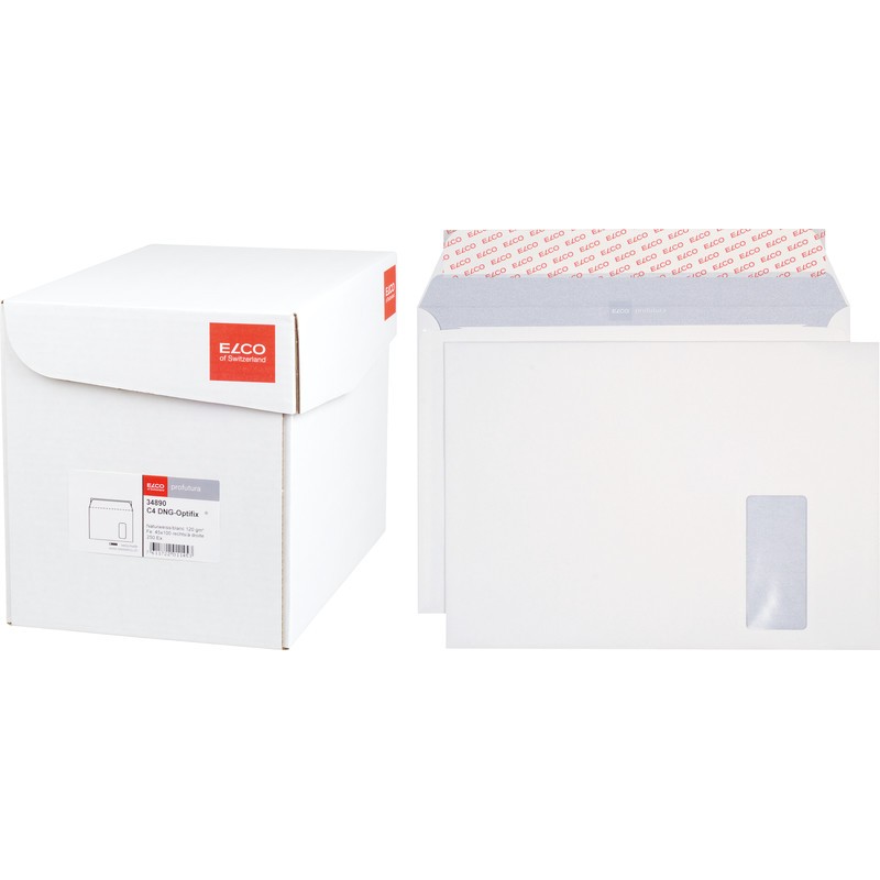 ELCO Briefumschläge Profutura in Bürogrosspackung naturweiss, 100% Recycling. Nachhaltigkeit eco:plus: recyclingfähig. C4, mit Optifix® Haftklebeverschluss. 324 x 229 mm, Façon DNG-HK. Schachtel zu 250 Stück. Nachhaltigkeit eco:plus: Zertifikat: FSC.