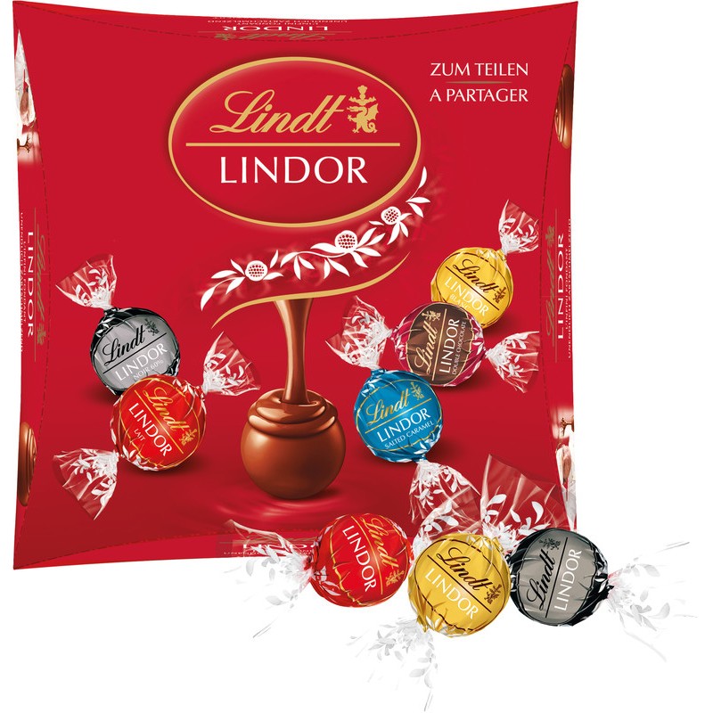 LINDT Lindor-Kugeln Sharing Box einzeln verpackt, 5 Sorten sortiert, Milch, Weiss, Dunkel 60% Kakao, Salted Caramel und Double Chocolate. Gewicht: 298 g.