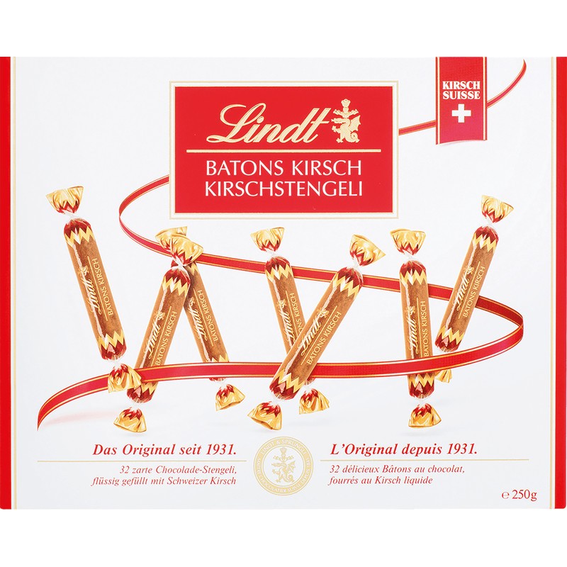 LINDT Kirschstengeli mit Alkohol aus Schokolade, flüssig gefüllt mit Schweizer Kirsch, mit Kakaopuder umschlossen, einzeln verpackt. Packung zu 32 Stück. Gewicht: 250 g. Enthält Alkohol.