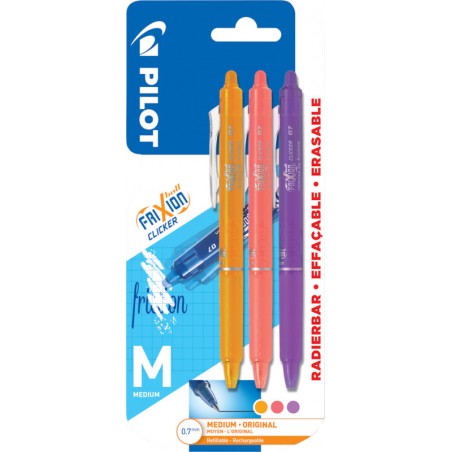 PILOT Roller FriXion Ball Clicker Druckmechanik am Clip, Schaft in der Schreibfarbe, mit ausradierbarer Tinte, Radiergummi am Schaftende nützt sich nicht ab, gibt keine Rückstände, radierte Stelle kann sogleich wieder überschrieben werden, nachfüllbar, Strichbreite 0,7 mm. Nachhaltigkeit eco:plus: verlängertes Produktleben.