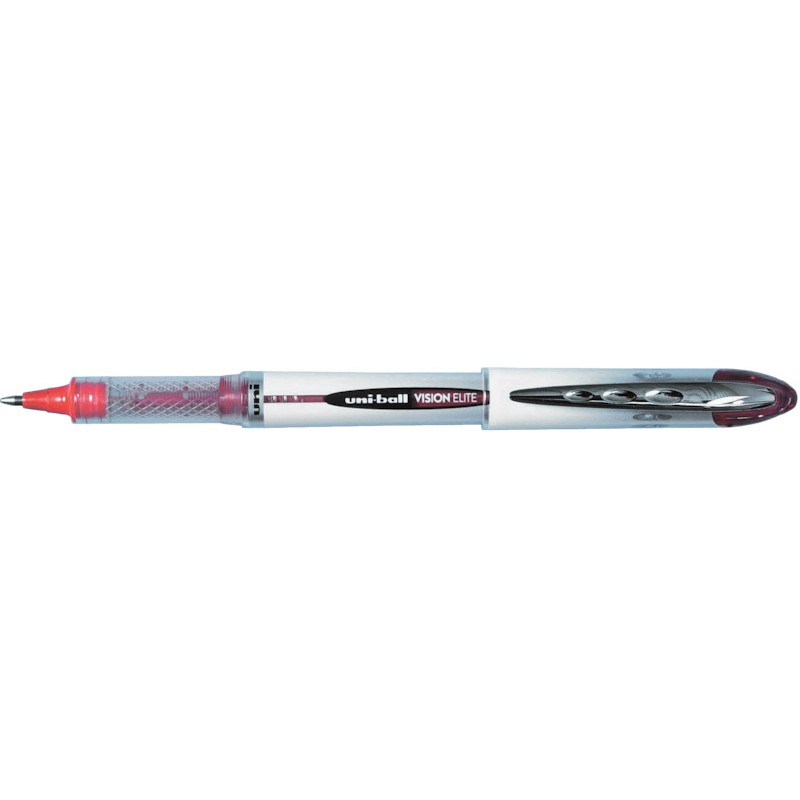 UNI-BALL Roller Vision Elite weisser Schaft aus PC, rostfreie Kugelspitze, wasserfeste und lichtbeständige Tinte, Sicherheits-System verhindert das Auslaufen der Tinte bei schnell wechselndem Luftdruck, Clip, Kappenende in der Schreibfarbe, Strichbreite 0,6 mm.