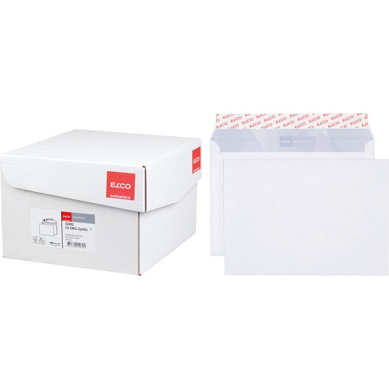 ELCO Briefumschläge Premium in Bürogrosspackung hochweisse Top-Qualität, chlorfrei, grauer Innendruck aus 100% Wasserfarbe. Nachhaltigkeit eco:plus: recyclingfähig. Zertifikat: FSC. C5, mit Optifix® Haftklebeverschluss 229 x 162 mm, Façon DNG-HK. Schachtel zu 500 Stück.