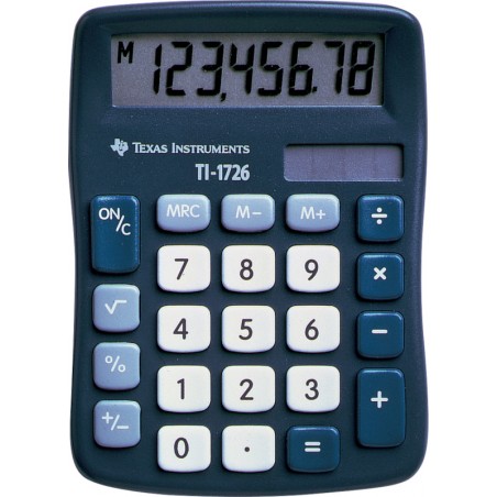 TEXAS INSTRUMENTS Grundrechner TI-1726 mit angewinkelter 8-stelliger LCD-SuperView-Anzeige, 4 Rechenarten, +/- Taste, Wurzeltaste, freier Speicher, Nachkommastellen. Stromversorgung: Solar- und Batteriebetrieb. Masse: B 83 x H 20 x T 110 mm. Gewicht: 61 g. Preis inkl. VRG.