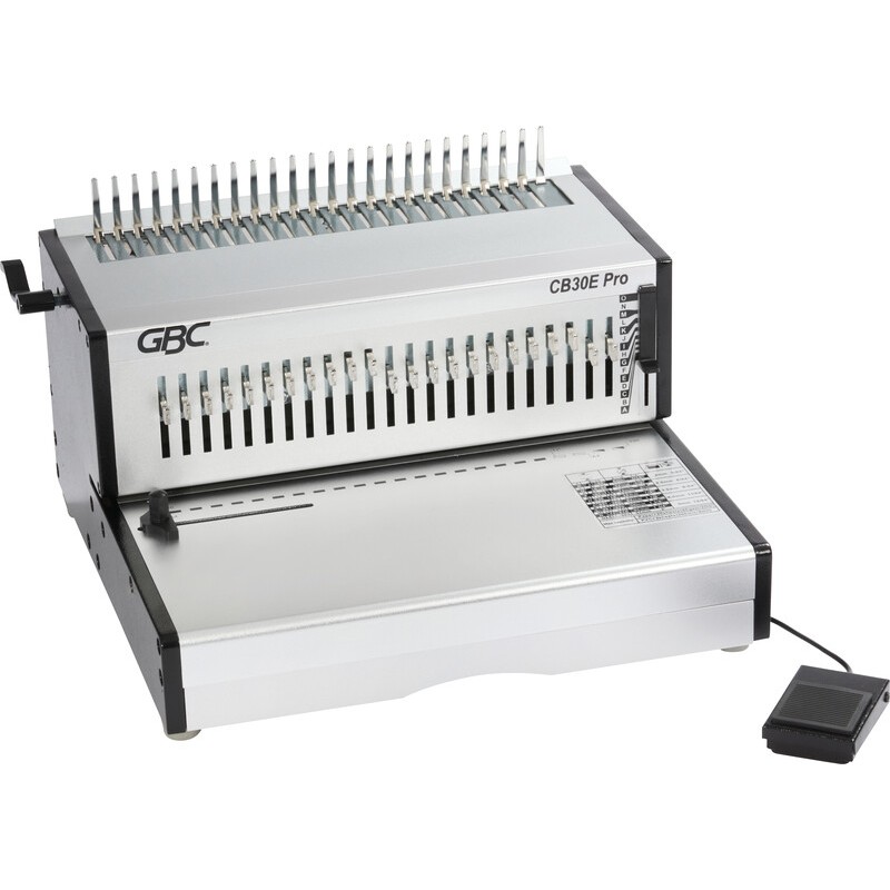GBC® Plastikbindegerät CB30EPro elektrisches Stanz- und Bindegerät, Stanzleistung ca. 30 Blatt, bis Format A4 hoch und A3 quer, geeignet für Plastikbinderücken bis Ø 51 mm (ca. 500 Blatt), 23 einzeln ausschaltbare Messer. Masse: B 451 x H 255 x T 397 mm. Gewicht: 19 kg. Preis inkl. VRG.