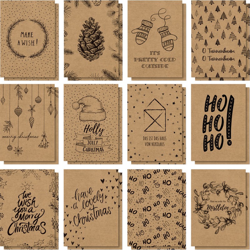 SIGEL Postkarten Weihnachten Text englisch und deutsch, 12 Motive sortiert, Format A6. Set zu 24 Stück. Geeignet für Kopierer, Laser-/Inkjetdrucker und Farblaserdrucker/-kopierer. Nachhaltigkeit eco:plus: recyclingfähig. aus Kraftpapier 225 g/m2.