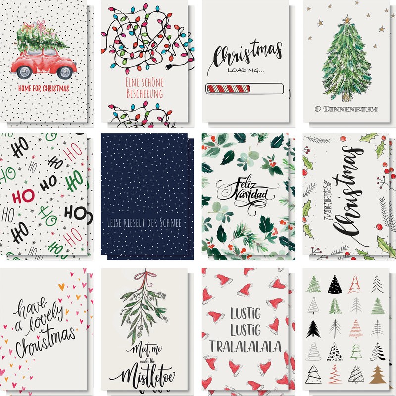 SIGEL Postkarten Weihnachten Text englisch und deutsch, 12 Motive sortiert, Format A6. Set zu 24 Stück. Geeignet für Kopierer, Laser-/Inkjetdrucker und Farblaserdrucker/-kopierer. Nachhaltigkeit eco:plus: recyclingfähig. aus Edelkarton 270 g/m2.