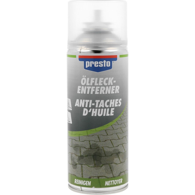 PRESTO® Ölfleck-Entferner Spray geeignet für alle saugenden und nicht saugenden Untergründe wie Beton, Estrich, Klinker oder Keramikfliesen, aus einem Abstand von 5 cm grosszügig auf den zu behandelnden Untergrund sprühen und ca. 10 Min. einwirken lassen. Dose zu 400 ml.