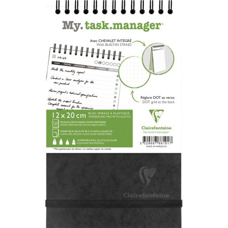 CLAIREFONTAINE Planer AgeBag Task M undatiert, 90 g/m2, Rückseite mit Punktraster, 250 Seiten, perforiert, Einband aus Karton, gekörnt mit Lederstruktur, langlebig und widerstandsfähig, mitintegriertem Aufsteller, Gummibandverschluss, Spiralbindung, geeignet für die Organisation von Aufgaben, das Festhalten von Gedanken usw. Format: 120 x 200 mm.
