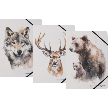 PAGNA® Gummibandmappe Save me aus Recyclingkarton, mit 3 Einschlagklappen, mit Gummibandverschluss, Fassungsvermögen bis 20 mm, für Format A4, 3 Motive sortiert, im Stil der Aquarellmalerei. Nachhaltigkeit eco:plus: recyclingfähig. No. 5, Hirsch, Wolf, Bär
