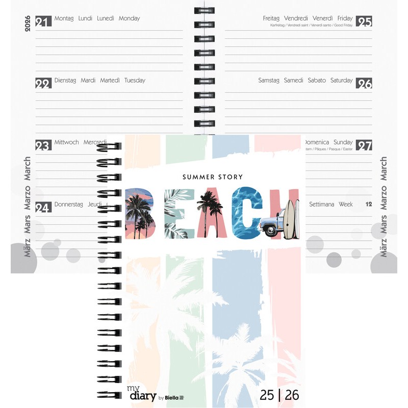 BIELLA Schüleragenda mydiary Wire-O 1 Woche auf 2 Seiten, Einband PP Cylar® und bedrucktes Papier, Kalendarium viersprachig d/f/i/gb, August - Juli, querliniert, mit Jahres- und Monatsseiten, Informationsteil, grosser Notizraum, Eckenperforation, Wire-O-Bindung. Nachhaltigkeit eco:plus: Zertifikat: FSC. Format: 12 x 16,5 cm Summer