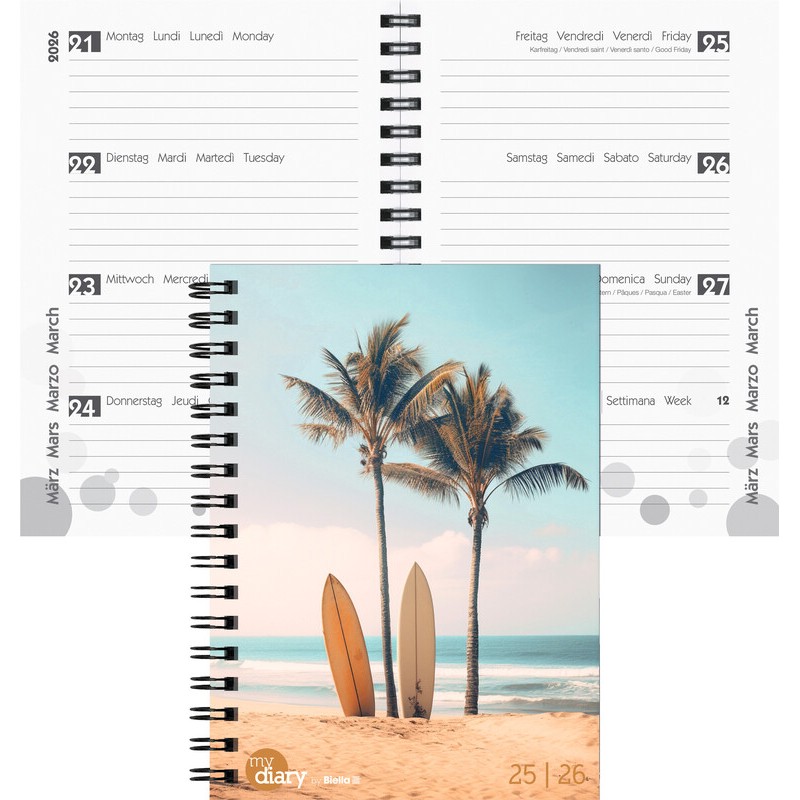BIELLA Schüleragenda mydiary Wire-O 1 Woche auf 2 Seiten, Einband PP Cylar® und bedrucktes Papier, Kalendarium viersprachig d/f/i/gb, August - Juli, querliniert, mit Jahres- und Monatsseiten, Informationsteil, grosser Notizraum, Eckenperforation, Wire-O-Bindung. Nachhaltigkeit eco:plus: Zertifikat: FSC. Format 12 x 16,5 cm Beach