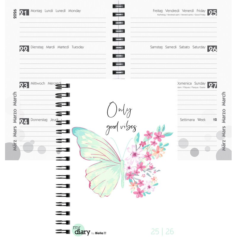 BIELLA Schüleragenda mydiary Wire-O 1 Woche auf 2 Seiten, Einband PP Cylar® und bedrucktes Papier, Kalendarium viersprachig d/f/i/gb, August - Juli, querliniert, mit Jahres- und Monatsseiten, Informationsteil, grosser Notizraum, Eckenperforation, Wire-O-Bindung. Nachhaltigkeit eco:plus: Zertifikat: FSC. Format: 12 x 16,5 cm Style