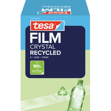 TESA® Klebeband Film eco & crystal ecoLogo® Trägerfolie aus 90% recycelten PET-Flaschen (rPET), Rollenkern aus 100% recyceltem Kunststoff, transparente, klare Qualität, nahezu unsichtbar auf fast allen Untergründen, starke Klebkraft, gleichmässiges und geräuschloses Abrollen, hohe Alterungsbeständigkeit, lösungsmittelfrei. Nachhaltigkeit eco:plus: abbaubar, recyclingfähig, recycelter Bestandteil, Recycelgehalt Abfall vor Gebrauch max. 10%, Recycelgehalt Abfall nach Gebrauch max. 10%, Abfallminderung.