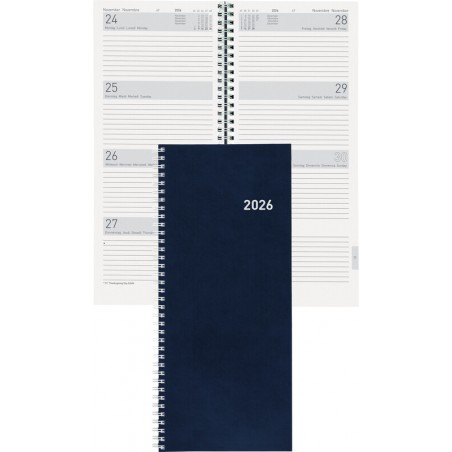 BIELLA Geschäftsagenda Langformat Twist 1 Woche auf 2 Seiten, Einband aus Karton, laminiert, Kalendarium viersprachig d/f/i/gb, querliniert, zusätzliche Jahres-, Monats- und Notizseiten, jede Seite mit Monatsübersicht, Registerdruck, Eckenperforation, Wire-O-Bindung, Format: 13,5 x 31,5 cm. Nachhaltigkeit eco:plus: Zertifikat: FSC. dunkelblau