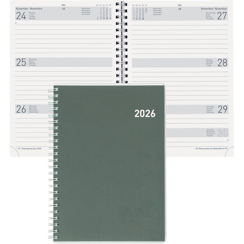 BIELLA Geschäftsagenda Dispo Term Wire-O 1 Woche auf 2 Seiten, Einband aus PP Cylar®, Kalendarium viersprachig d/f/i/gb, querliniert, zusätzliche Jahres-, Monats- und Notizseiten, jede Seite mit Monatsübersicht, Eckenperforation, Wire-O-Bindung, Format 14,5 x 20,5 cm. Nachhaltigkeit eco:plus: Zertifikat: FSC. grau