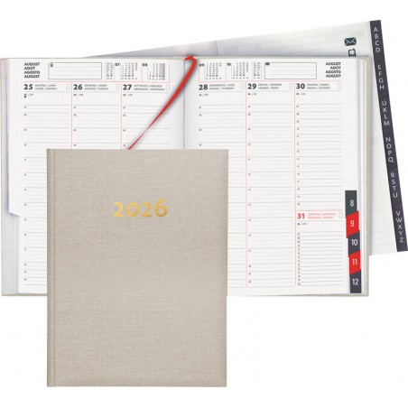 BIELLA Geschäftsagenda Orario® 1 Woche auf 2 Seiten, Einband wattiert, Kalendarium viersprachig d/f/i/gb, querliniert, Stunden-Einteilung (07.00 - 20.00 Uhr), zusätzliche Jahres-, Monats- und Notizseiten, jede Seite mit Monatsübersicht, auswechselbares Adressenregister, Registerschnitt, Zeichenband, Format: 17,8 x 23,5 cm. Nachhaltigkeit eco:plus: Zertifikat: FSC. Einband Leinenoptik beige