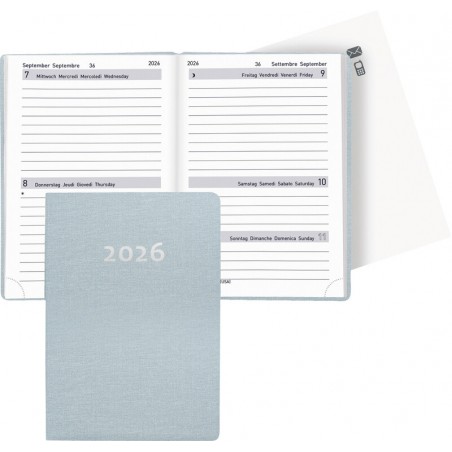 BIELLA Taschenagenda Tell 2 Tage pro Seite, Sa. + So. auf 1/2 Seite, Kalendarium viersprachig d/f/i/gb, querliniert, zusätzliche Jahres-, Monatsseiten, Notizseiten perforiert, auswechselbares Adressenregister, Eckenperforation, Format: 8,5 x 12,5 cm. Nachhaltigkeit eco:plus: Zertifikat: FSC. Einband Leinenoptik hellblau