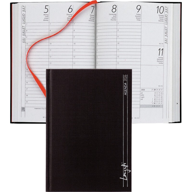 BIELLA LONGATTI Taschenagenda 1 Woche auf 2 Seiten, Einband aus Kunstleder, Kalendarium viersprachig d/f/i/gb, querliniert, Stunden-Einteilung (07.00 - 19.00 Uhr), zusätzliche Jahres-, Monats- und Notizseiten, Doppelseite mit Monatsübersicht und Notizfeldern, Adressenregister, Zeichenband, Format: 10,4 x 14,8 cm. schwarz