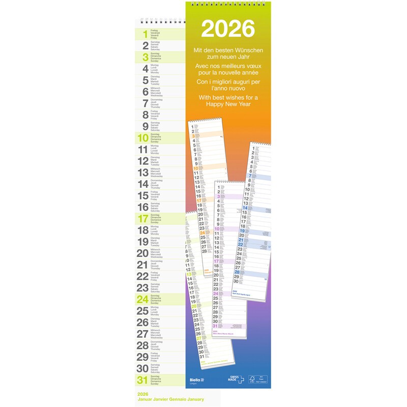 BIELLA Wandkalender 1 Monat pro Blatt, aus Papier, weiss, Druck mehrfarbig, Kalendarium viersprachig d/f/i/gb, Wire-O-Bindung und Aufhänger. Nachhaltigkeit eco:plus: Zertifikat: FSC. Longus 12 x 54,5 cm
